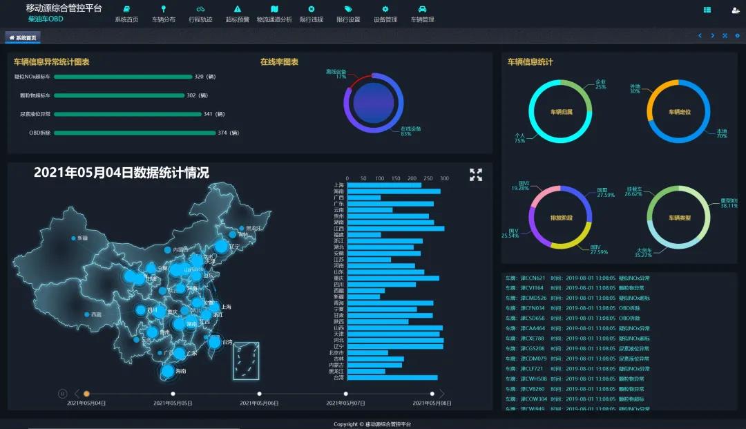軟件平臺功能包括:GIS一張圖展示、車輛分布、形成軌跡管理及超標報警查詢等。該系統(tǒng)通過一張GIS圖展示在線柴油貨車所在位置的熱力圖、車輛的分類比例以及排放階段占比等,可動態(tài)滾動播放柴油貨車的預(yù)警報警信息。