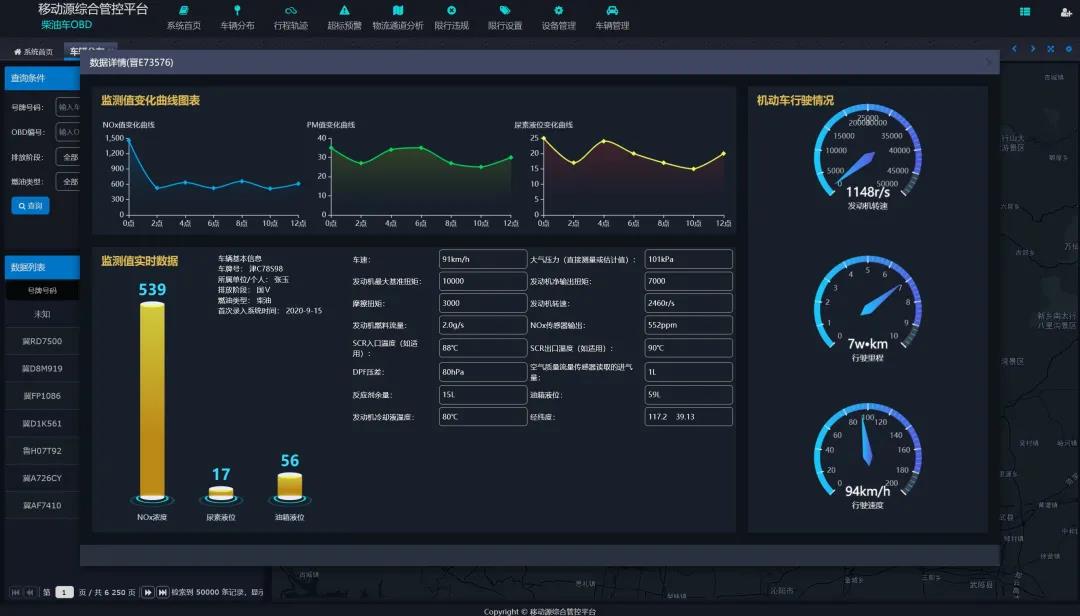 客戶可根據(jù)需要通過查詢功能查看某一輛柴油貨車的位置、里程、實時車速、污染物排放曲線和尿素消耗曲線等詳細信息。
